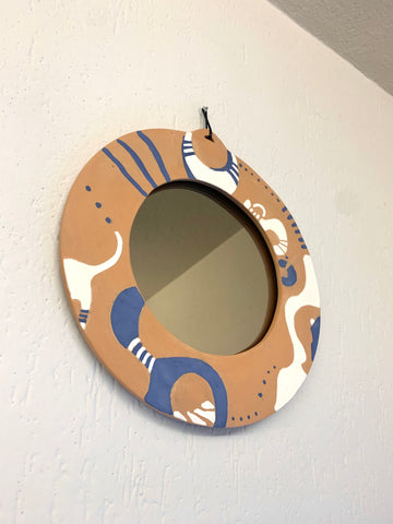 Specchio fatto a mano, decorato attraverso il mio iconico disegno, proveniente dalla collezione "Uncoscious Rhythm". Il blu e il bianco dei disegni astratti sono in contrasto con colore della terracotta non smaltata lasciato nel suo stato più grezzo.