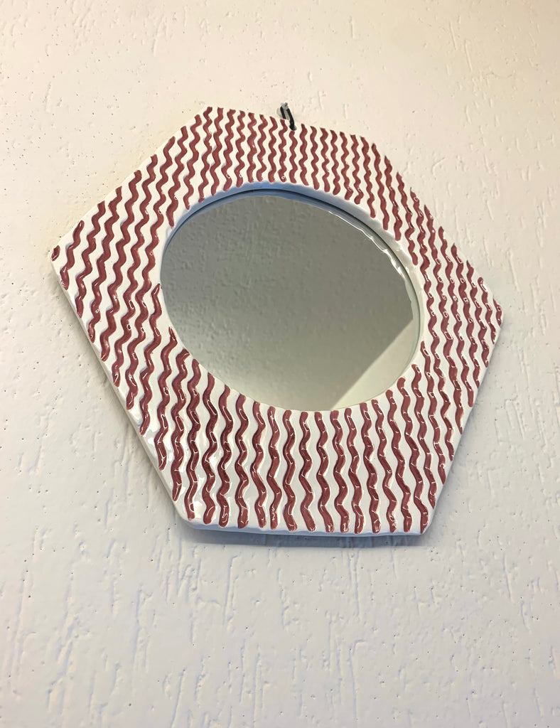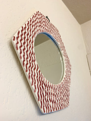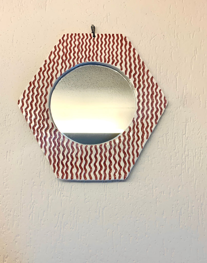 Specchio fatto a mano, decorato con linee scavate e infine dipinte con un colore vinaccia.
