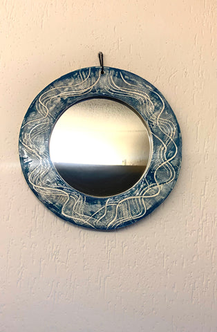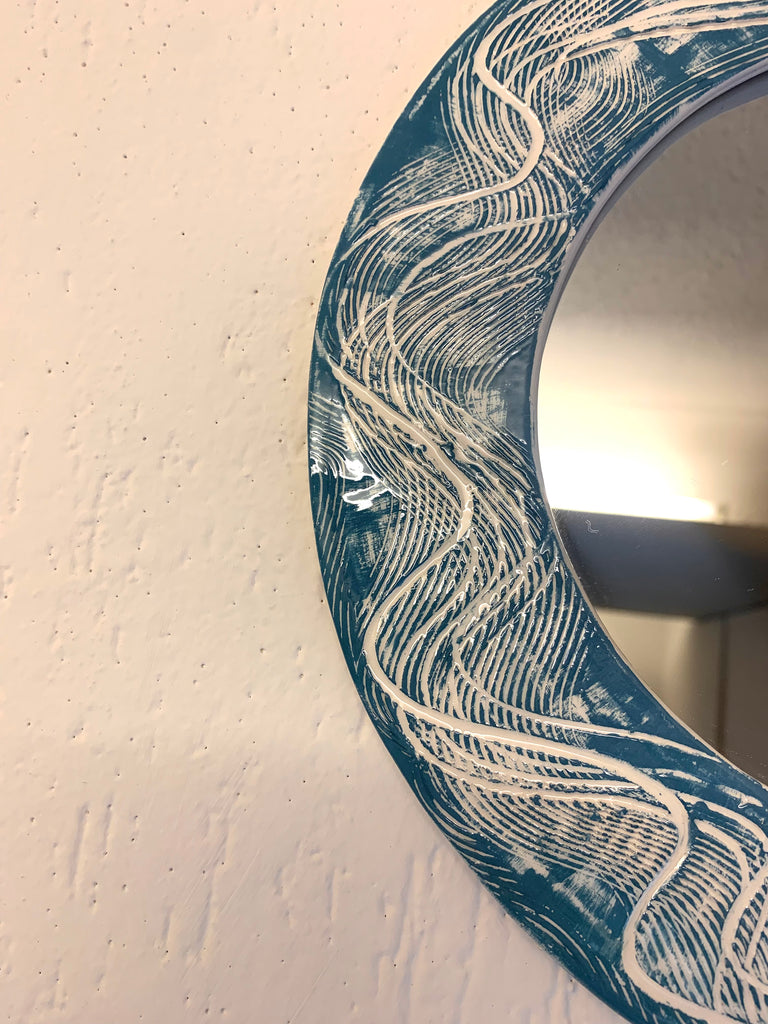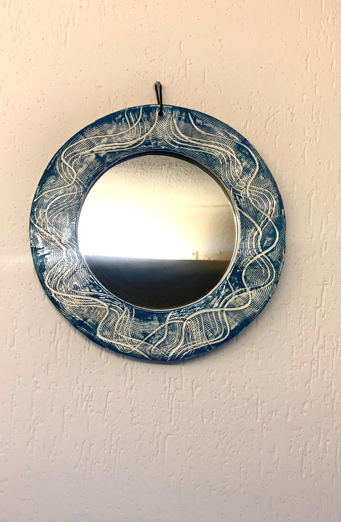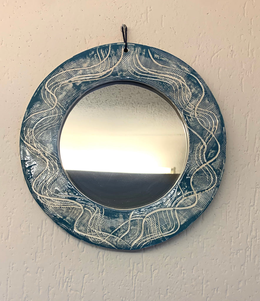 Handmade ceramic mirror, hand painted with emerald textures in contrast with the white of the clay used.